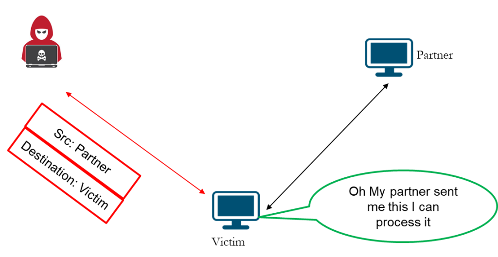In an Impersonation Attack, the attacker sources packets that seem to originate from a trusted partner or system. By forging the Source IP Address, the attacker effectively impersonates a legitimate host in the communication chain. The victim, unaware of the deception, receives the packet and assumes it’s from a known and authorized source: “Oh, my partner sent me this; I can process it.”