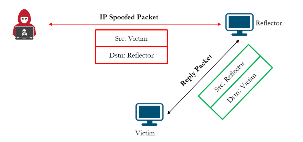 In a Reflection Attack, the attacker forges packets that appear to come from the victim and sends them to several reflectors, typically servers or devices that automatically reply to incoming requests. Each reflector, believing the request is legitimate, responds to the victim’s IP address, unknowingly helping the attacker flood the victim with a surge of traffic.