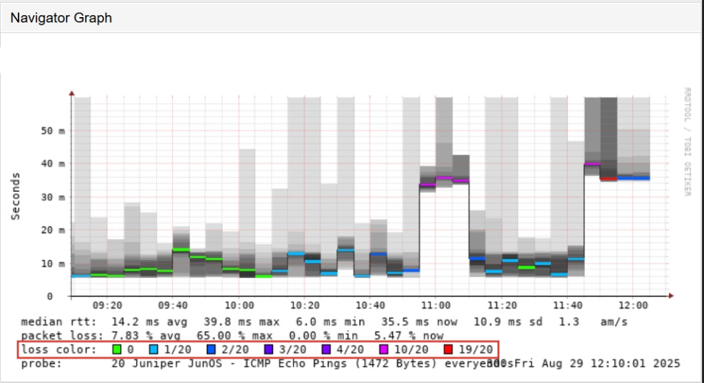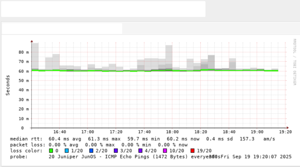 SmokePing monitors path health by sending multiple probes at set intervals to carefully chosen targets beyond each provider’s network. This approach ensures that the measurement reflects not just whether a provider’s link is up, but also how well it performs when carrying real traffic across its routes. The tool collects latency, jitter, and packet loss data, then turns it into graphs that make performance issues easy to spot.