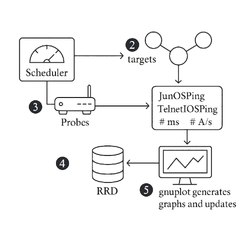 Each probe writes its latency and packet-loss measurements to a dedicated Round-Robin Database (RRD). RRDs efficiently store time series data at fixed intervals, automatically rolling off older data to maintain a constant database size.